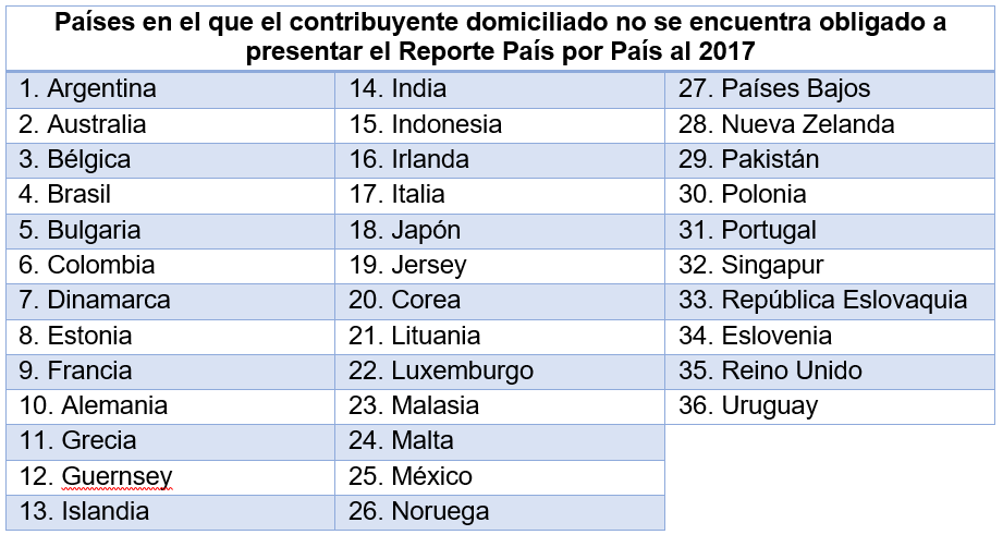 Cabe indicar que el pasado 12 de marzo la SUNAT comunicó que en vista de la celebración por parte del Perú del Acuerdo entre autoridades competentes (AAC) para el intercambio del Reporte País por País, en el marco de la Convención sobre Asistencia Administrativa Mutua en Materia Fiscal (CAAMMF), que dispone el intercambio automático de información del mencionado Reporte entre las autoridades fiscales, que no se encuentra obligado a presentar el Reporte País por País correspondiente al ejercicio 2017, si usted es un contribuyente domiciliado integrante de un grupo multinacional de acuerdo a lo dispuesto en el artículo 116 del Reglamento de la Ley del Impuesto a la Renta, cuya matriz no domiciliada tenga residencia o domicilio en alguna de las siguientes jurisdicciones: